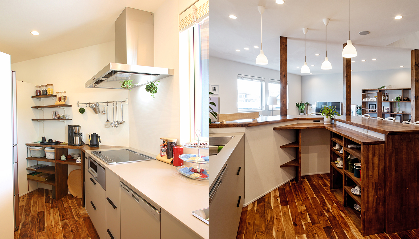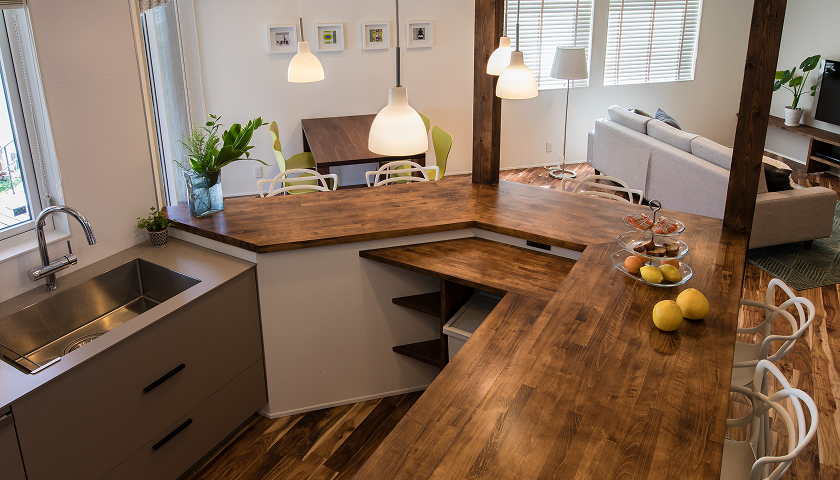無垢材の床や木を使った造作のカウンターなどナチュラル